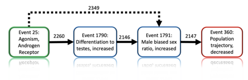 This adverse outcome pathway links androgen receptor agonism in teleost fish during gonadogenesis to male-biased sexual differentiation and consequently, reduced population growth rate. Sex determination in teleost fishes is highly plastic; it can be genetically or environmentally influenced. Species with environmentally-based sex determination in particular can be very sensitive to exogenous chemicals during the period of differentiation. Exogenous hormones are of ecological concern because they have the potential to alter gonad development and sex differentiation. Activation of the androgen receptor (AR) by endogenous androgens plays a crucial role in normal sex differentiation, sexual maturation, and spermatogenesis in vertebrates and inappropriate signaling by exogenous AR agonists can disrupt theses processes. For example, studies have shown that during early development in some teleost species, exposure to androgenic steroids can induce complete gonadal sex inversion, resuting in male-biased sex ratios. This can lead to impacts on population growth rates due to the decreased number of reproductively viable females in the population.