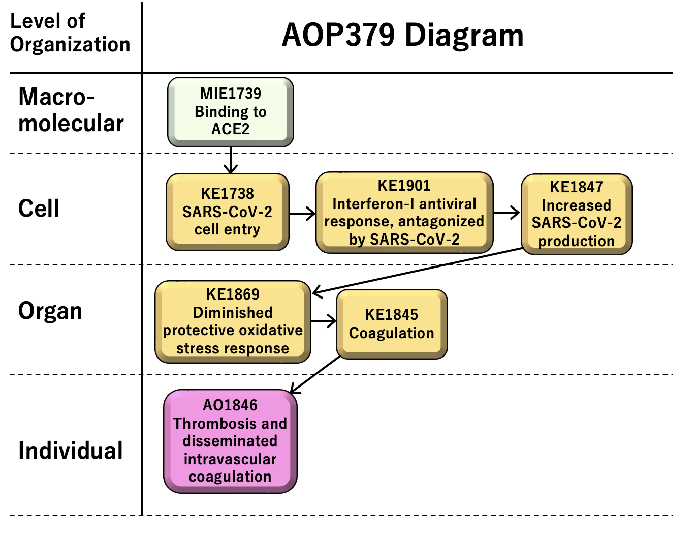 This AOP379 has been developed in the collaboration of Modelling the Pathogenesis of COVID-19 using the AOP framework (CIAO) international consortium (Clerbaux et al., 2022, Nymark et al., 2024). Extensive efforts in discussion and literature search of the group crystalized into many AOPs related to coronavirus pathogenesis and coronavirus infectious disease 2019 (COVID-19), where the AOP379 focuses on the thrombosis and disseminated intravascular coagulation as adverse outcome of severe acute respiratory syndrome coronavirus 2 (SARS-CoV-2) infection through reactive oxygen species-induced oxidative stress response (Tanabe et al., 2022).