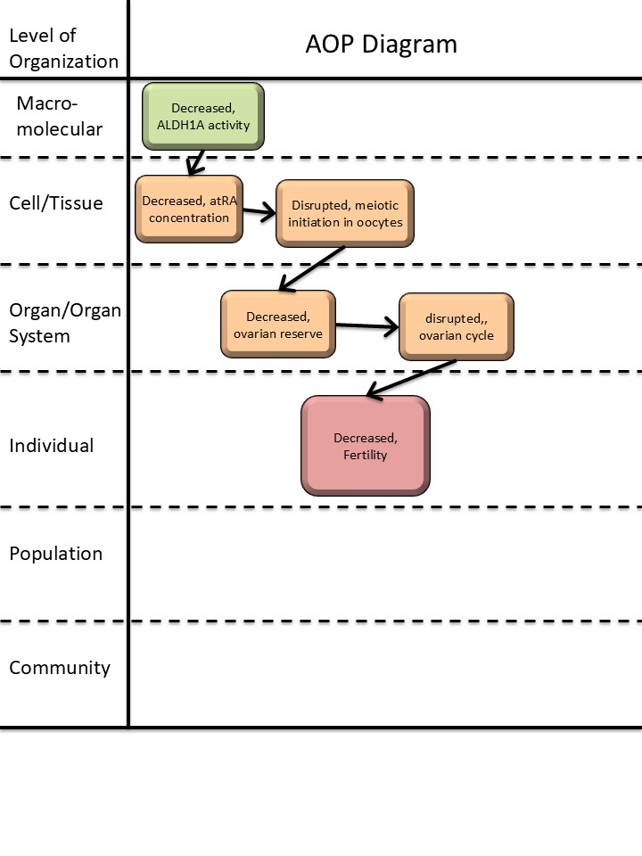 This AOP links inhibition of ALDH1A during fetal life with female infertility in adulthood. A key step in this AOP is a reduction in all-trans retinoic acid (atRA) locally in the fetal ovary, which prevents resident germ cells (oocytes) from entering meiosis. Evidence for this AOP, especially upstream events, draws heavily from mouse studies, both genetic models and from exposure studies (including explanted ovaries). Human evidence is also available, especially for downstream events where the oocyte pool/ovarian reserve is known to directly impact on fertility. In reproductive toxicity (animal studies and human epidemiology) fertility is an apical endpoint of high importance and has strong utility for chemical safety assessments. Infertility can be caused by many, and varied, factors, but this AOP focusses on linking perturbed meiosis through disrupted atRA signaling during development, thus supporting the use of data from in silico and in vitro measurements for interference with nuclear receptor activity (RAR/RXR) and atRA synthesis/expression to infer potential to cause in vivo effects.