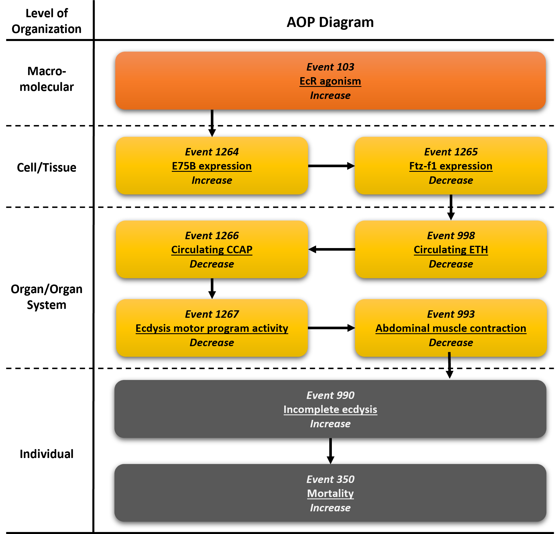 The development of this AOP is motivated by regulatory needs to understand and predict the impacts of insect growth regulators and other endocrine-active chemicals that target EcR. Such compounds are widely used in pest control but pose risks to non-target arthropods, including pollinators and aquatic invertebrates. The AOP formalizes knowledge of conserved molting endocrine pathways to support hazard identification and potential regulatory screening frameworks.