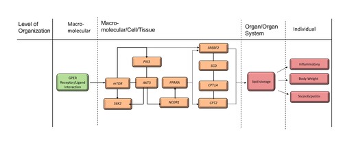 GPER活化被鉴定为TPP通过GPER信号通路诱导的脂质代谢异常中的主要MIE。TPP可以通过 影响TM6来诱导随后的信号通路,包括PI3K-Akt / NCOR1和mTOR / S6K2 / PPARα作为KE1(图6)来发挥GPER的激动作用。CPT1A和CPT2)与脂肪酸氧化代谢有关,并上调与脂质和脂肪酸合成(KE2)相关的基因(SREBF2和SCD)的表达。这些KLE最终通过与脂质代谢异常的分子因果关系导致脂质过度积累