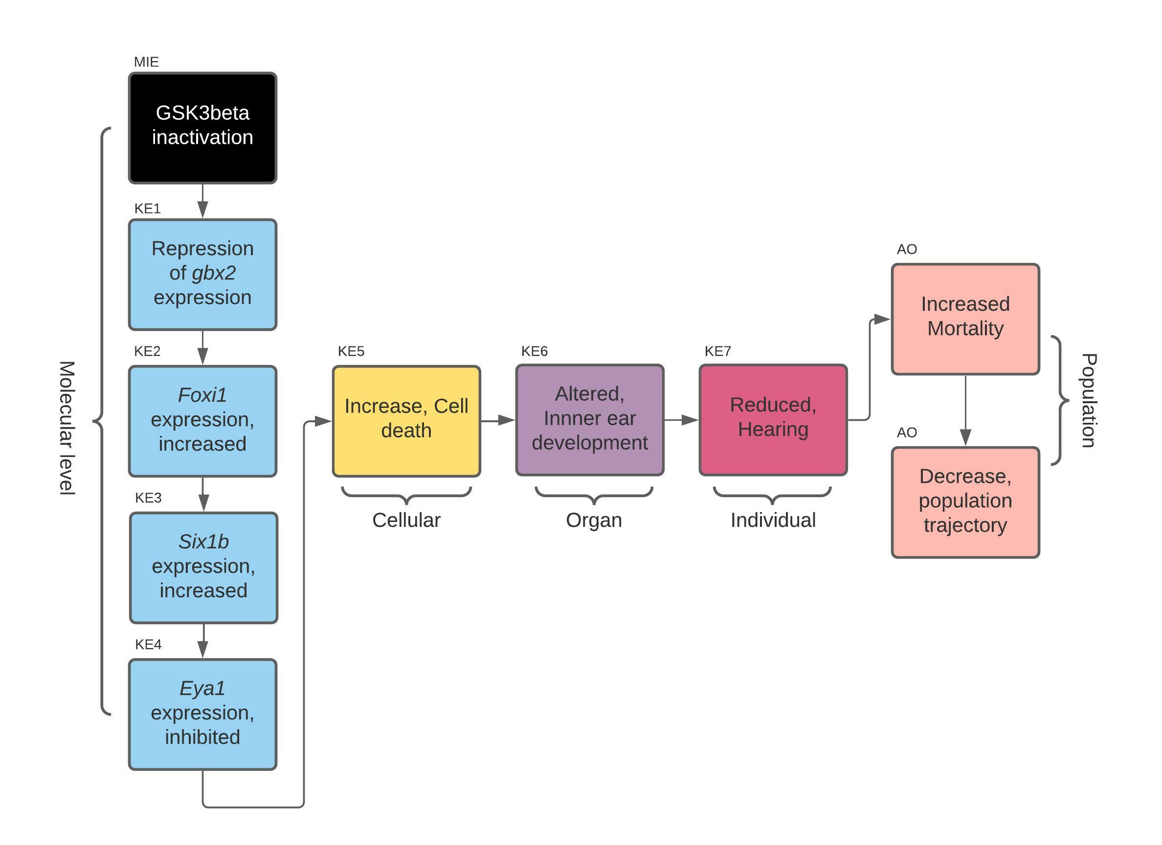 An overall assessment of this AOP shows that there is low to moderate biological plausibility to suggest a qualitative link between the inactivation of Gsk3b to the KE4-cell death within developing inner ear and high evidence linking KE5 to increased mortality (AO). Biological plausibility is considered moderate because there is ample evidence from gain- and loss- of function experiments and knock out animal models that support the relationships between key events which are consistent with current biological knowledge, but there is mostly indirect evidence linking KEs on molecular level. KEs on molecular level have some uncertainties like foxi1 loss of function experiment resulting in no expression of six1b in otic placode (due to absence of otic placode) and inconsistencies across species (zebrafish, mouse). The evidence for essentiality of the KEs is mostly missing therefore the overall assessment of essentiality is low. The same goes for empirical support, currently there is no evidence for empirical support. Additional studies are needed to obtain data for empirical support, therefore, the empirical support of KERs is considered is low.