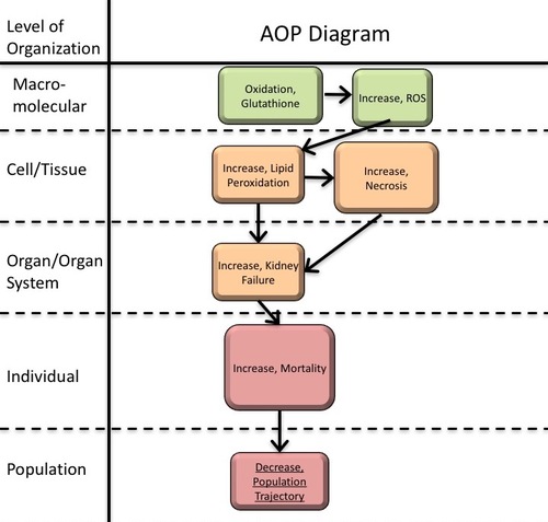 - At high concentrations of the stressor, it may be expected that reduced glutathione is found at a higher concentration in exposed subjects compared to a control (Kelly and Janz 2009). This is confusing at first, but may be appropriate. Because there is an increase in ROS, a feedback loop exists where the increase in ROS causes an increase in production of reduced glutathione to combat the increased ROS production. There is still oxidation of glutathione occuring, however, an increase in reduced glutathione may also be an indicator or an increase in ROS. At low concentrations, the expected result can be seen where there is a decrease in reduced glutathione or increase in oxidized glutathione compared to a control (Song et al. 2012). Theoretically, in propagating this AOP, oxidized glutathione should typically be in a higher ratio compared to reduced glutathione. Yet, these processes are quite complex and also may very from species to species or organism to organism. They key indicator is an imabalance in the anti-oxidant mechanisms existing with (reduced/oxidized) glutathione.