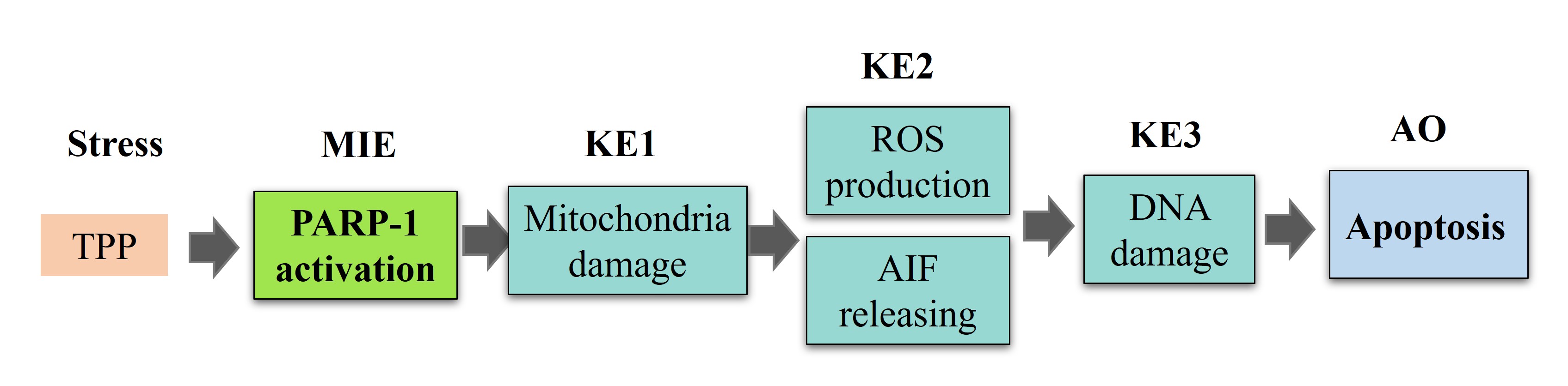 The changes of PARP1 activity were considered as the molecular initial event. The activated PARP1 affected the downstream key events, such as the damage of mitochondrial structure and function, apoptotic factors AIF release and ROS production and DNA damage. These key events finally induced cell death through PARP1 dependent pathway. Mitochondrial PARP1 was a vital target to illuminate the early mechanism of apoptosis induced by typical organophosphate ester.