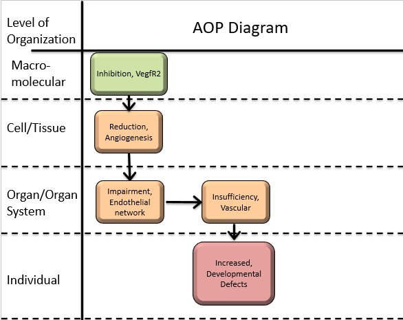 DESCRIPTION: This AOP focuses on the regulation and disruption of vasculogenesis-angiogenesis during embryonic development via disruption of the VEGF-signaling pathway. VEGFA binding to its cognate receptor (VEGFR2) triggers angiogenic sprouting, growth and fusion during early development, and in flow-sensing adaptation of vascular development during later development. VEGFR2 inhibition, the postulated molecular initiating event (MIE) for this AOP, may be invoked by effects on VEGFA production, mobility, or receptor binding, and by effects on VEGFR2 cellular expression, molecular function or post-receptor signal transduction pathways. Downstream key events (KE) include altered cell fate and behavior of 'endothelial tip cells' (exploratory behavior, cell migration) and endothelial 'stalk cells' (cell proliferation, apoptosis). KE relationships (KERs) leading to vascular insufficiency then involve local interactions with other cell types (stromal cells, macrophages), the extracellular matrix (ECM) and micro-physiology (hemodynamics, metabolism). Adverse outcomes (AO) would ultimately vary by anatomical region, organ system, gestational stage and state of the embryo, fetus or placenta when an MIE is invoked.