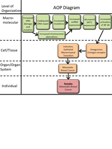 This adverse outcome pathway details the effect of alcohol as a stressor in metastatic breast cancer. Aim of this AOP is intended to detail the linkage between alcohol and miRNA- SIRT-1 axis induced metastatic breast cancer which represents a knowledge gap as there are not many references available. Consecutive KEs identified are as follows.