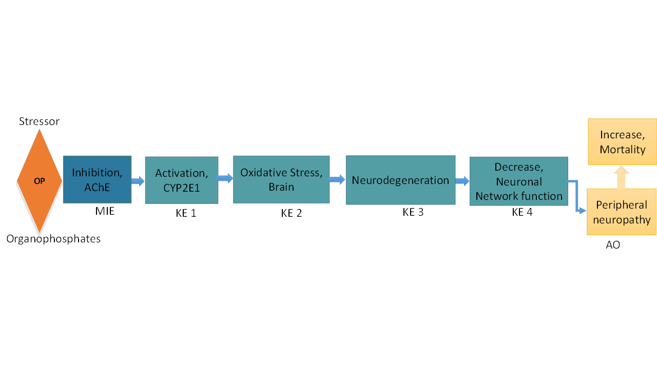 Organophosphate compounds (OP) such as paraoxon, ethyl parathion, methyl parathion and others are widely used insecticides. OP compounds are also being developed as warfare nerve agents like soman, sarin and tabun etc. The present adverse outcome pathway (AOP) utilizing the existing key events (KEs) and describes the risk associated with a characteristics OP exposure via acetylcholinesterase (AChE) inhibition as molecular initiating event (MIE), which roots a series of KEs that ultimately manifest the adverse outcomes (AO) of sensory axonal peripheral neuropathy and mortality. The MIE of inhibited AChE triggers the KEs: activation of CYP2E1 (aopwiki.org/events/1508), oxidative stress (aopwiki.org/events/1392), neurodegeneration (aopwiki.org/events/352), decreased neuronal network function in adult brain (aopwiki.org/events/618), sensory axonal peripheral neuropathy (aopwiki.org/events/1583) and increased mortality (aopwiki.org/events/351). The OP insecticides inhibits AChE by inhibition of serine esterases and proteases via phosphorylation (Amitai G et al., 1998, Petroianu GA et al., 2001). Farm workers exposed with commonly used OP showed sharp decrease in blood AChE (MIE) level simultaneously over expression of CYP2E1 (KE1) at mRNA level (Sharma RK et al., 2013). CYP2E1-induced oxidative stress (KE2) by over activation of JNK signaling (Schattenberg JM et al., 2014). Literature further supported that oxidative stress causes neurodegeneration (KE3) by targeting different cellular macromolecules including membrane lipid peroxidation, mitochondrial dysfunction and oxidation of protein and nucleic acid (Gandhi S et al., 2012). Thus neurodegeneration and oxidative stress are inherently related phenomena, since microglia and astrocytes are the main sources of reactive oxygen species in CNS degenerative disorders consequently oxidative stress in brain caused neurodegeneration (Mendonca HR et al., 2020, Wakatsuki S et al., 2015, Mishra V et al., 2015, Kim M et al., 2019). Neurodegeneration leads to impairment of retrograde axonal transport that prohibits the growth factor supply to long-range projection neurons, causing synapse loss, and post-synaptic dendrite retraction that leads to decrease of the neuronal network in adult brain (KE 4) (aopwiki.org/relationships/647, Seeley WW et al., 2009). Palop et al (2006) also advocated that neurodegeneration leads to neural network dysfunction. Consequently, loss of neuronal network function in adult brain leads to an important adverse outcome sensory axonal peripheral neuropathy and symptoms include numbness, lack of coordination, impairment of motor nerve, dizziness, burning sensation etc. (Diantonio et al., 2019, Valek L et al., 2019, Persson AK et al., 2016, Topp KS et al., 2000). Thus this AO represents a disparate group of diseases where epidemiological features indicate the potential for a secondary AO of mortality as final adverse outcome (Taverner T et al., 2019, Martyn CN et al., 1997, Hughes RA et al., 1995). Thus this AOP established the connection between OP chemicals and sensory axonal peripheral neuropathy including mortality to endorse predictive toxicology.