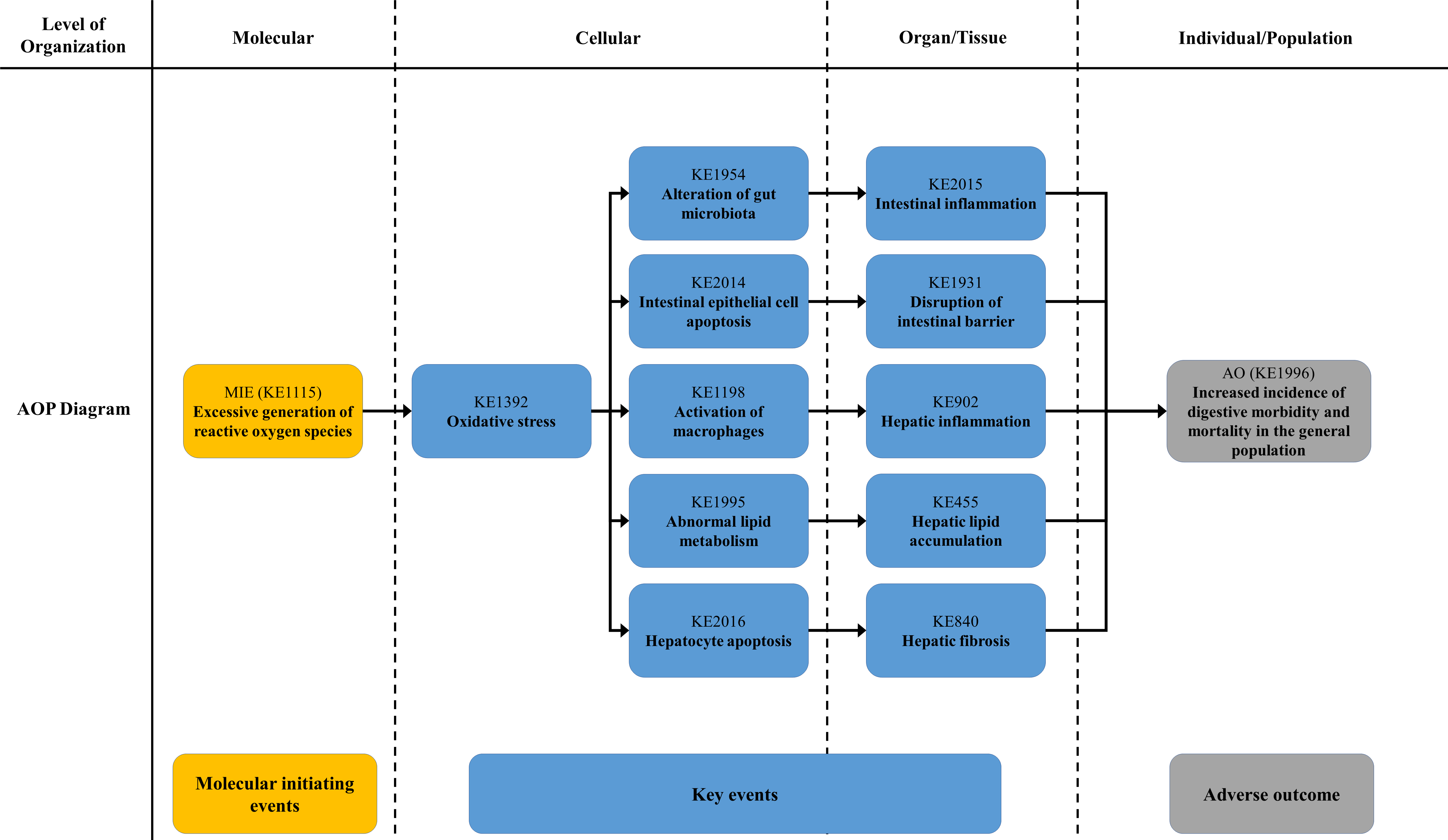 A graphical representation of the AOP.This graphic should list all KEs in sequence, including the MIE (if known) and AO, and the pair-wise relationships (links or KERs) between those KEs.