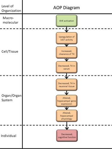 This AOP summarises the findings of Kohn et al. 1996 and other papers that corroborate its findings, whilst also summarising evidence of hippocampal and mental effects on rodents of TCDD and various PCBs, although their effects on the thyroid directly and other organs cannot be ruled out. Relevant publications were found by searching through PubMed for terms such as "AhR" "thyroxine" "TCDD" "T4".