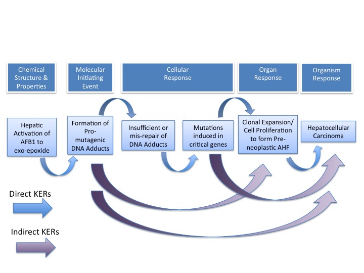 This AOP describes the KE that are specific to a mutagenic MOA for AFB1 (e.g., [pre-Molecular Initiating Event or pre-MIE: metabolic activation,] MIE: pro-mutagenic AFB1 DNA adduct, KE#1: insufficient/mis-repair of DNA, KE#2: induced mutation in critical gene). In addition, this AOP includes all of the steps involved from the exposure to AFB1 through to the appearance of the HCC, the adverse outcome. KE#3, the occurrence and growth of altered hepatic foci and the subsequent development of HCC (as described below) are events that would be involved in the etiology of all HCC whether occurring through a mutagenic MOA or another, different MOA. Although AFB1-specific information is lacking for these later steps in the AOP, the accumulated scientific knowledge of the development of HCC includes the recognition that all AOPs leading to HCC have a number of general steps in common; thus, these general steps are included in this AOP and are identified as not being specific to AFB1-induced HCC.