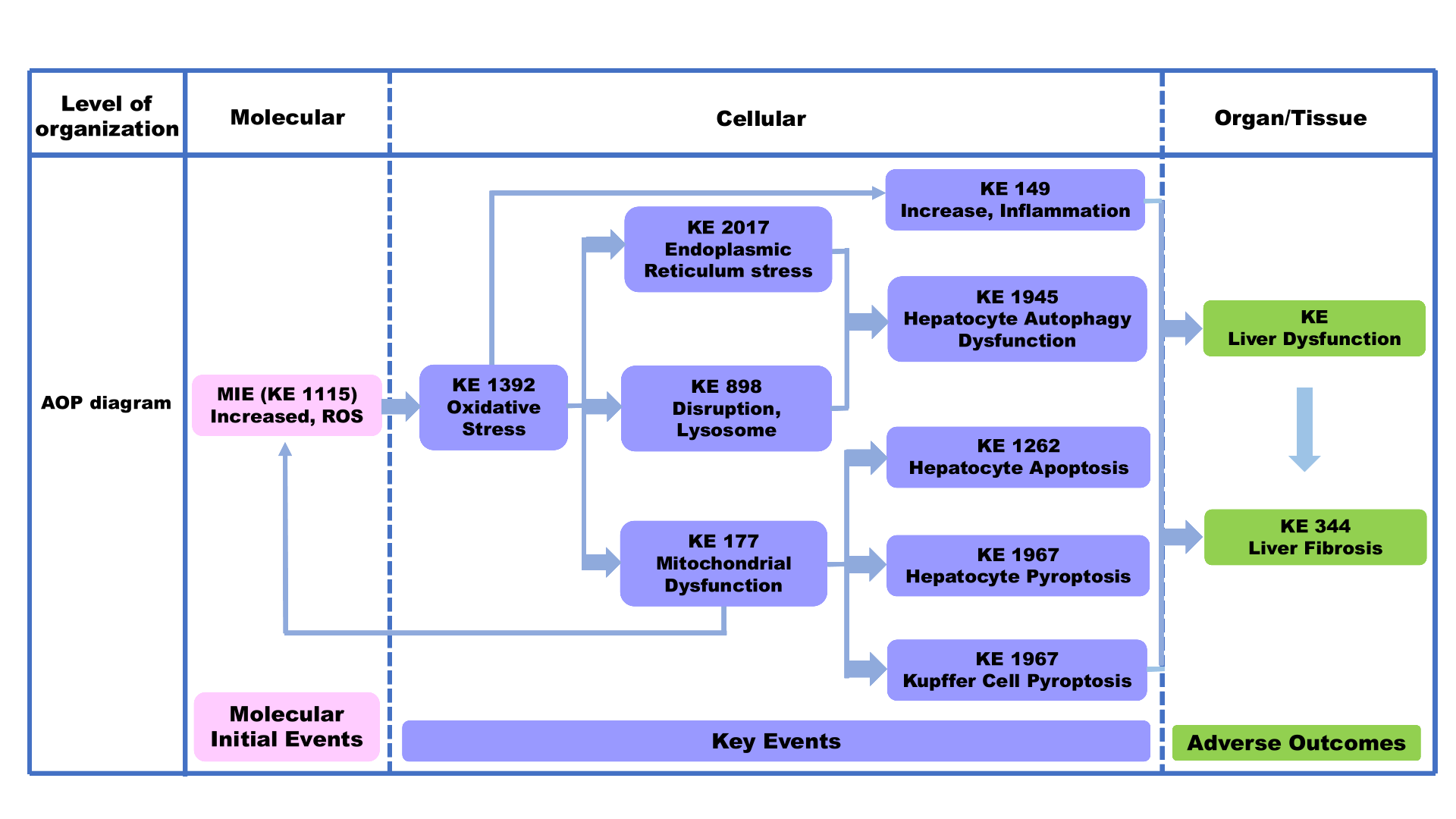 A graphical representation of the AOP.This graphic should list all KEs in sequence, including the MIE (if known) and AO, and the pair-wise relationships (links or KERs) between those KEs.