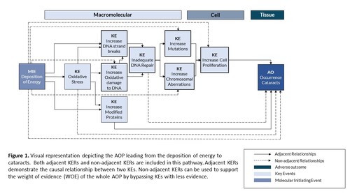 This AOP provides a summary of the relevant studies and endpoints that can inform future research designed to understand the role of radiation in causing cataracts. Assays and study designs spanning biological levels of organization across relevant models were identified, with the end goal to improve testing strategies and understanding in risk from low dose low dose-rate exposures.