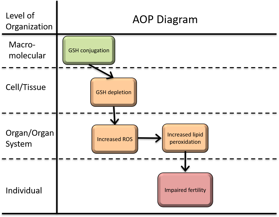 In this context, impaired fertility and GSH conjugation were hypothesized as Adverse Outcome (AO) and Molecular Initiating Event (MIE), respectively, for this AOP. Subsequently, increased ROS and increased lipid peroxidation were selected as key intermediate events.