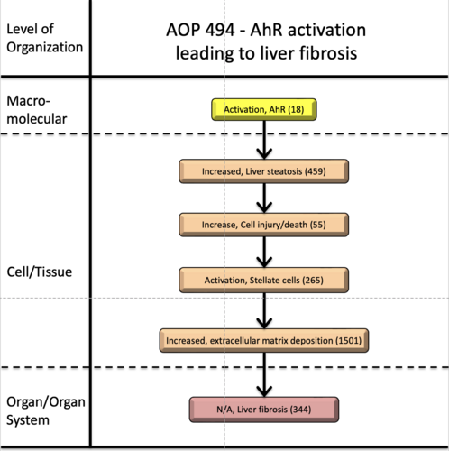 The AOP described is valid for both sexes. Epidemiological studies carried out on chronic hepatitis patients living around the Da Nang air base in Vietnam have shown that increased levels of TCDD in the blood were associated, among other things, with elevated stages of liver fibrosis (classified using the METAVIR fibrosis staging system); this is also true for PCDF. Dioxins and furans are specific ligands of the AhR (whose activation represents MIE and hepatic fibrosis AO) (doi: 10.3390/toxics10060315). These results suggest that exposure to TCDD can influence an evolution of the hepatic environment towards fibrosis, which also increases the risk of liver cancer. They suggest that all subjects living in dioxin-contaminated areas in Vietnam should undergo regular check-ups, in particular liver function tests and imaging examinations. These results are consistent with experimental studies, which are consistent with the conservation of the AhR pathway in vertebrates. Thus, animal models (mainly rodents) have been used to study this fibrogenesis, demonstrating that the co-occurrence of external factors (high-fat diet, for example) contributes to this fibrosis at low doses of AhR ligands.