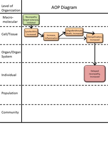 Literature reviews were conducted by searching through databases including PubMed and Google Scholar. Search terms included “organophosphates”, “OPIDN”, “OPIDP”, and “delayed neuropathy” used in combination with a variety of phrases such as “enzyme inhibition”, “demyelination”, “demyelinating lesions”, “weakness”, and “endogenous substrate.” After establishment of the general outline for the AOP, search terms broadened to commonly include the words “neuropathy target esterase”, “irreversible aging”, “lysolecithin”, “lysophosphatidylcholine”, “inflammation”, “chemokines”, “surfactant”, “membrane disruption”, “oligodendrocyte susceptibility”, and “oligodendrocyte death.” Exclusion criteria included publications that focused on nervous tissue damage that did not involve changes to oligodendrocytes or myelin considering that this pathway focused on a single mechanism of a larger overall AOP network, and the goal was to specifically focus on progression of demyelination causing delayed neuropathy. Additional resources were also identified in the references of publications explored during database searches and were used to further develop KEs.