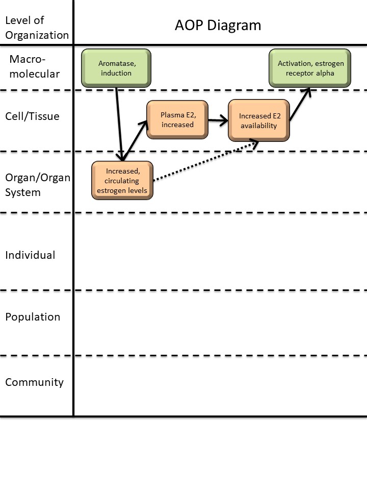 A graphical representation of the AOP.This graphic should list all KEs in sequence, including the MIE (if known) and AO, and the pair-wise relationships (links or KERs) between those KEs.
