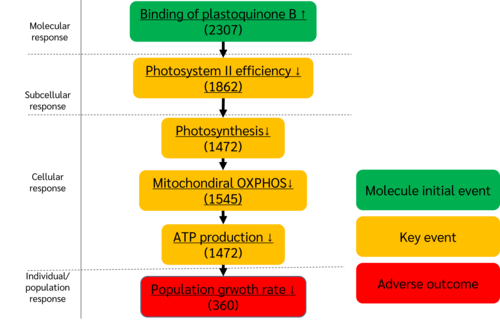 The present AOPdescribes the potential causal events initiated by the binding of photosystem II (PSII) inhibitors to the plastoquinone B (QB) site of the D1 protein within the PSII complex (MIE, event 1975), leading to a decrease in population growth rate in primary producers (adverse outcome, event 2181) via a cascade of intermediate key events (KEs), including inhibition of PSII electron transport (event 1976), decrease in PSII efficiency (event 1977), and ultimately, decrease in growth rate (event 2031). The Table 1 provides a summary of the KEs that constitute the AOP and the representative methods for measurement of each KE.