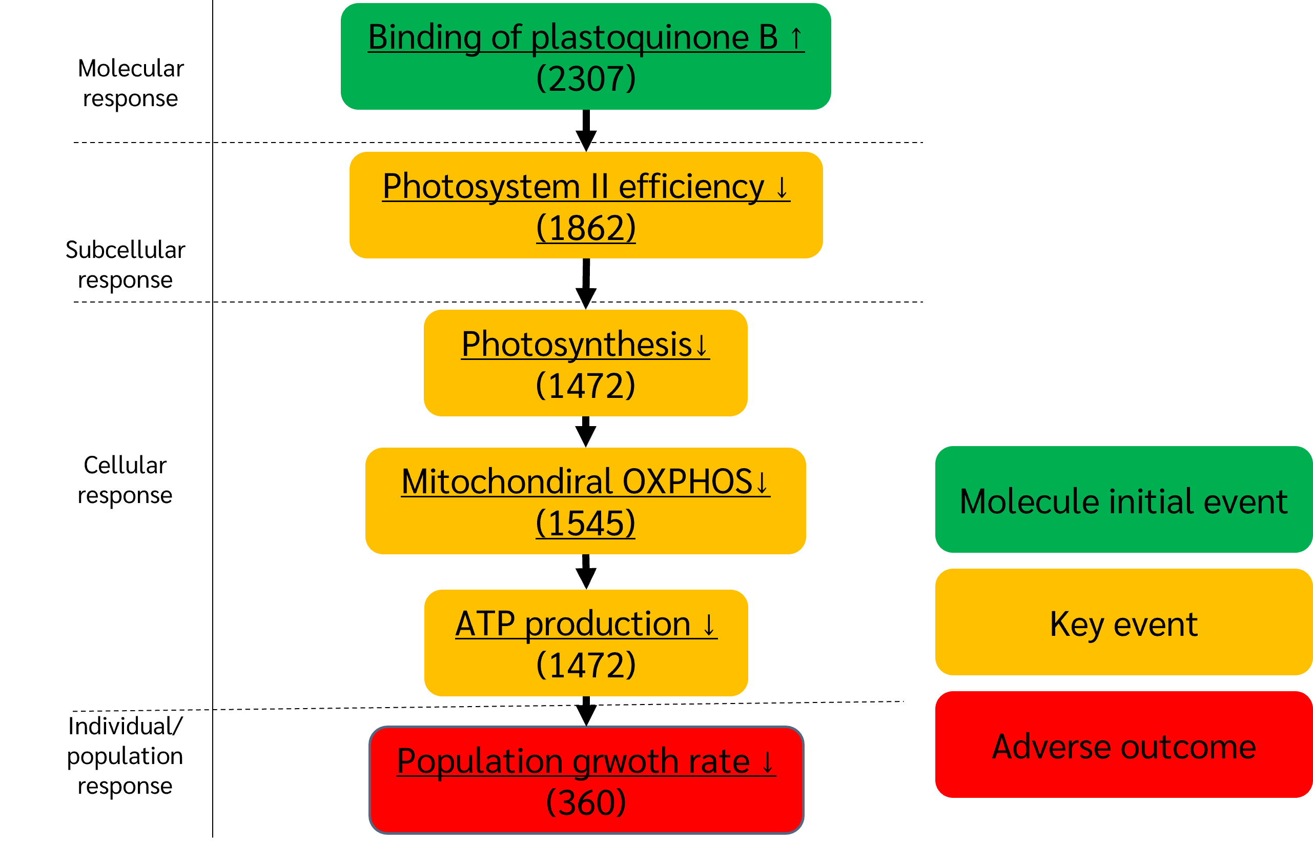 The MIE constitutes the competitive binding of PSII inhibitors to the QB site, which disrupts the transfer of electrons between QA and QB. This blockage has a direct inhibitory impact on the functioning of the PSII complex and causes the first downstream KE: the inhibition of PSII efficiency, which is typically reported as Fv/Fm ratio or ΦPSII. The lower PSII efficiency is an indication of reduced energy conversion in the light-dependent components of photosynthesis. As a logical physiological consequence, this leads to a decrease in carbon fixation and the availability of ATP and NADPH, both of which are essential for cellular growth. here is a consequent decrease in the rate of organismal growth, particularly on the taxa that grows fast like phytoplankton and aquatic plants.