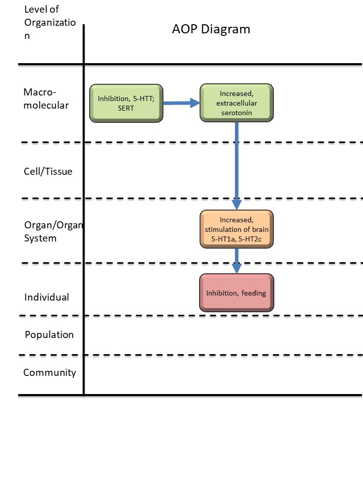 The focus of the originating work was to use an AOP framework to examine inhibition of 5-hydroxytryptamine transporters in fish by selective serotonin reuptake inhibitor (SSRI) toxicants, to review known roles of serotonin receptors to explore mechanisms of action, and to determine toxicity endpoints. McDonald (2017) used the Read-Across Hypothesis, which postulates that pharmaceuticals will cause comparable effects in different taxa if the pathways and targets are evolutionarily and functionally conserved (Rand-Weaver et al. 2013), to link effects of serotonin pathways in fish and mammals.