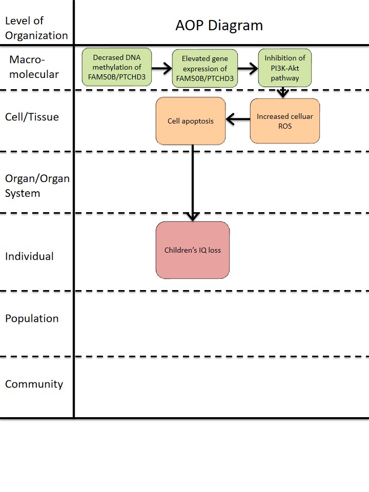 Intelligence quotient (IQ) test scores are important endpoints for international agencies interested in protecting the brain health from heavy metal exposure. However, IQ test has been hampered by a lack of efficient tools. At present, IQ test is mainly relied on Wechsler Intelligence Assessment Scale, this method consumes a lot of manpower and material resources, and cannot achieve high throughput assessment. The motivation for developing this adverse outcome pathway (AOP) was to provide new method for IQ assessment by DNA methylation in a high throughput way. In this AOP, the decreased DNA methylation of FAM50B and PTCHD3 induced by heavy metal exposure (such as lead, arsenic, and so on) is the molecular initiating event (MIE) of this AOP. Decreased DNA methylation of FAM50B/PTCHD3 leads to the elevated gene expression of FAM50B/PTCHD3, which is one of the key events (KE) of molecular level. This KE leads to the inhibition of PI3K-Akt pathway, which is another KE of molecular level, leading to increased celluar ROS and cell death (two KEs of cell level). These KEs finally result in the IQ loss of children (the adverse outcome of individual level).