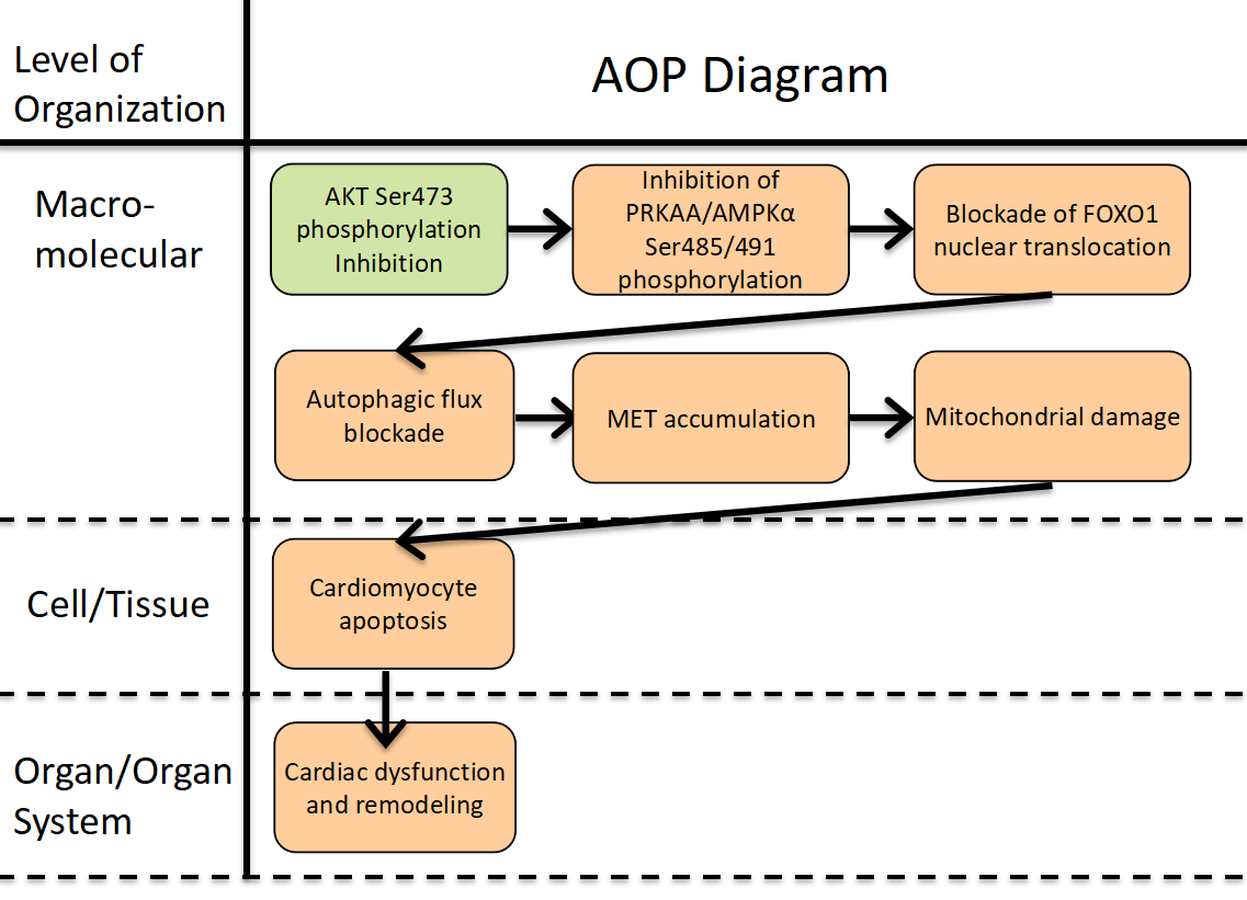 Drawing from previous research, a specific adverse outcome pathway (AOP) has been identified, potentially mediated by AKT Ser473 phosphorylation Inhibition, likely offering insights into specific molecular mechanisms contributing to cardiac toxicity. In this AOP, the Molecular Initiating Event (MIE) is "AKT Ser473 phosphorylation Inhibition," triggering six Key Events (KEs): " Inhibition of PRKAA/AMPKα Ser485/491 phosphorylation ," "Blockade of FOXO1 nuclear translocation," "Autophagic flux blockade," "MET accumulation," "Mitochondrial damage," and "Cardiomyocyte apoptosis." Ultimately, this pathway culminates in the Adverse Outcome (AO) of Cardiac dysfunction and remodeling.