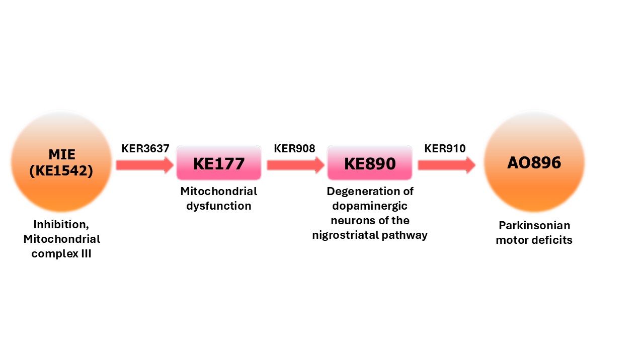 Evidence from literature consistently indicates that a relationship exists between pesticide exposure and the onset of parkinsonian motor deficit (Ntzani et al., 2013). The European Food Safety Authority (EFSA) started a project to provide a theoretical basis explaining the link between cI inhibition and neurotoxic adverse outcomes (manifesting in loss of dopamine neurons) (EFSA 2017). This resulted in the development of AOP 3 (inhibition of cI leading to parkinsonian motor deficits) and its endorsement by the OECD. The AOP 3 became a test/pilot case for exploring the use of AOP informed IATA in risk assessment (Bennekou et al.-OECD 2020). The AOP was initially exemplified by studies on rotenone and MPTP/MPP+. Subsequent work explored whether also the inhibition of other complexes of the respiratory chain might show similar effects. Systematic approaches, based on the 2017 version of AOP3 and case studies of regulatory relevance, indicate the contribution of the inhibition of mitochondrial complexes other than complex I, i.e. cIII (Table 1). These observations justify the integration of published data on complex III inhibition. The implementation of the AOP 3 is based on a negotiated procedure with EFSA (Reference: NP/EFSA/PREV/2024/02), which is intended to update AOP 3 by adding more evidence to the AOP wiki. The focus of the project is the transformation of AOP 3 into an AOP network for adult neurotoxicity, which involves expanding the number of MIEs.