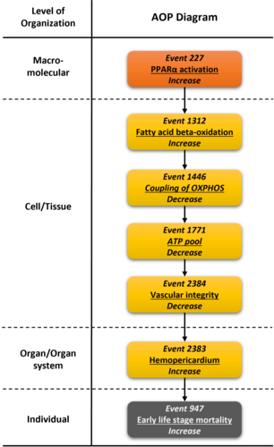 This AOP was developed to capture the conserved mitochondrial and metabolic perturbations following PPARα activation observed in multiple species. Peroxisome proliferators, including PFAS and phthalates, activate PPARα and induce transcriptional programs that increase β-oxidation of fatty acids. Excessive β-oxidation perturbs mitochondrial homeostasis, resulting in oxidative stress, ATP depletion, and vascular defects. These mechanisms are consistent with observed early life stage lethality in zebrafish and other fish models exposed to PPARα agonists. The AOP contributes to the expanding network of metabolism-centered AOPs and provides biological context for developmental toxicity mechanisms without relying on animal testing.