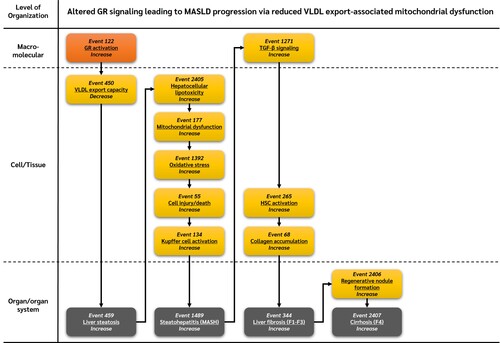 This AOP was developed to capture a distinct and mechanistically relevant route by which altered GR signaling promotes MASLD progression, emphasizing impaired lipid export rather than increased lipid supply. The pathway reflects clinical and experimental observations that defects in VLDL secretion contribute to steatosis, lipotoxic stress, mitochondrial dysfunction, and progressive liver injury.
