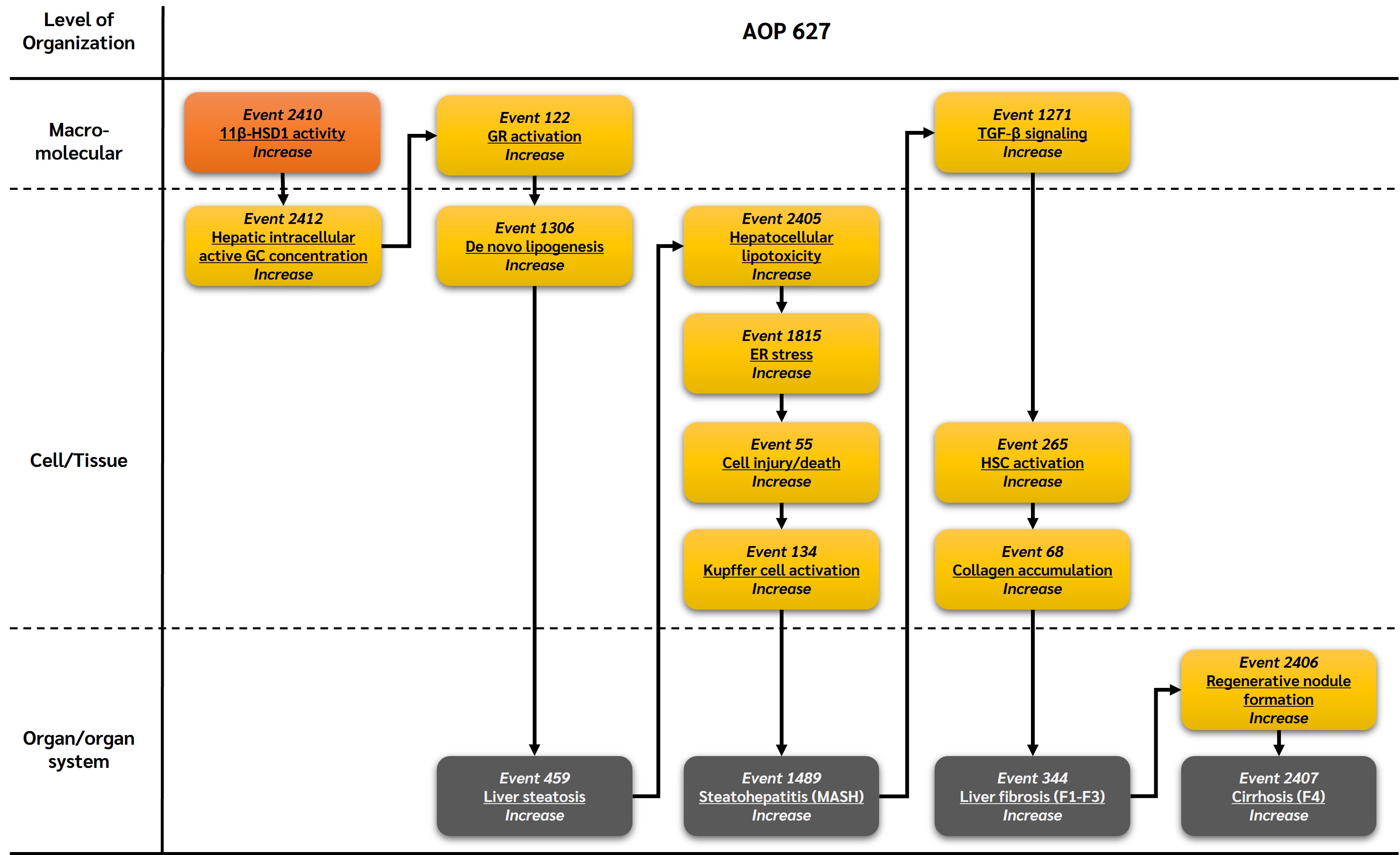 Glucocorticoid receptor (GR) signaling plays a key role in metabolic homeostasis, insulin sensitivity, and lipid flux regulation. Altered GR signaling—whether due to dysregulation or chemical interference—can induce systemic insulin resistance, increased adipose lipolysis, and hepatic lipid influx, thereby promoting ER stress. This AOP was developed to explicitly capture ER stress as a mechanistically distinct and biologically important mediator linking GR dysregulation to MASLD progression.