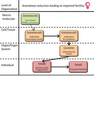 The contributing MIE in the pathway proposed is activation of PPARα supported by experimental evidence of dual activation of PPARα/γ by MEHP leading to decreased expression and activity of aromatase in granulosa cells (Lovekamp-Swan, Jetten, and Davis 2003) and inhibition of aromatase expression upon activation of PPARα by the ligand, fenofibrate, in the ovary of mouse (Toda et al. 2003).